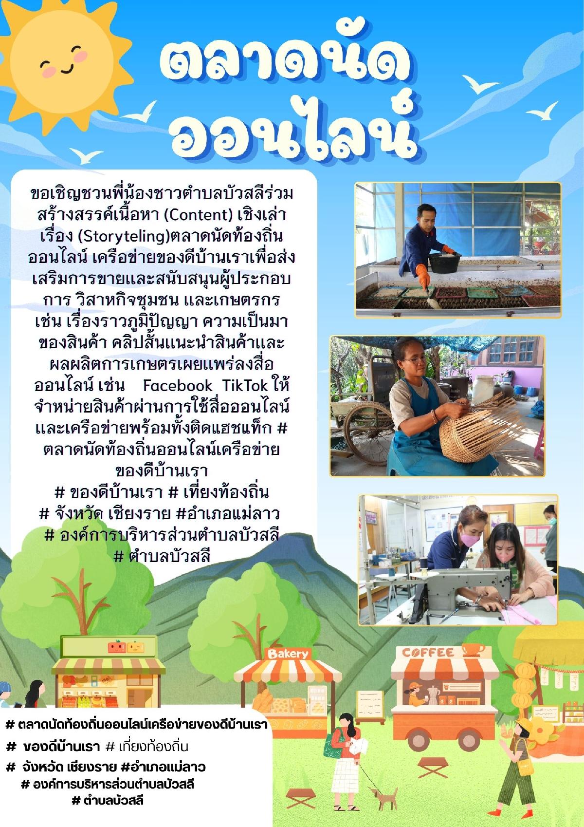 ขอเชิญชวนพี่น้องชาวตำบลบัวสลีร่วมสร้างสรรค์เนื้อหา (Content) เชิงเล่าเรื่อง (Storyteling)ตลาดนัดท้องถิ่นออนไลน์ เครือข่ายของดีบ้านเราเพื่อส่งเสริมการขายเเละสนับสนุนผู้ประกอบการ วิสาหกิจชุมชน เเละเกษตรกร เช่น เรื่องราวภูมิปัญญา ความเป็นมาของสินค้า คลิปสั้นเเนะนำสินค้าเเละผลผลิตการเกษตรเผยเเพร่ลงสื่อออนไลน์ เช่น Facebook TikTok ให้จำหน่ายสินค้าผ่านการใช้สื่อออนไลน์เเละเครือข่ายพร้อมทั้งติดแฮชแท็ก # ตลาดนัดท้องถิ่นออนไลน์เครือข่ายของดีบ้านเรา