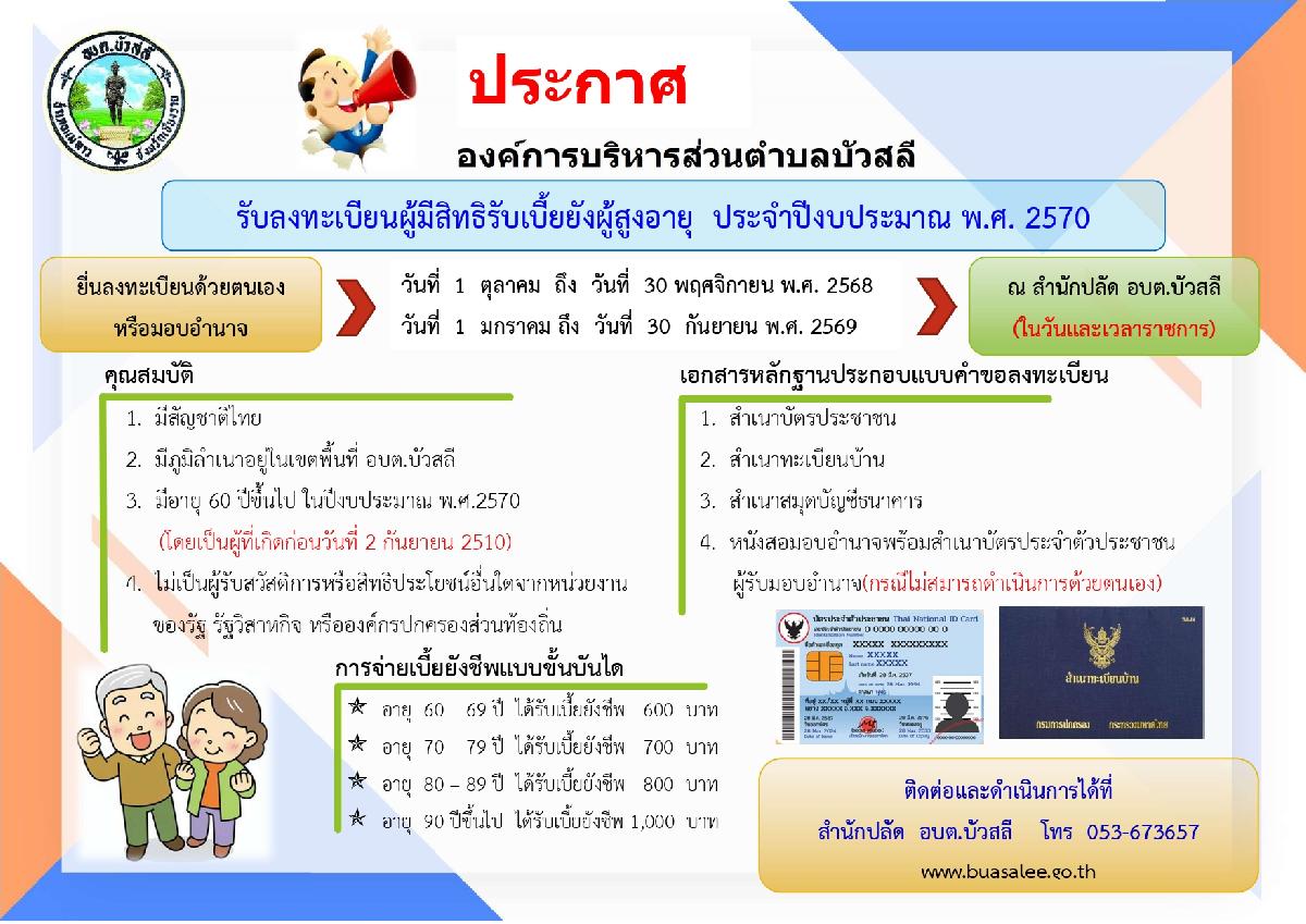ในการนี้ เพื่อเป็นการเตรียมความพร้อมด้านข้อมูลในการเสนอของบประมาณ เบี้ยยังชีพผู้สูงอายุและผู้พิการ ประจำปีงบประมาณ พ.ศ. 2570 องค์การบริหารส่วนตำบลบัวสลี จึงขอความร่วมมือจากท่านดำเนินการประชาสัมพันธ์แนวทางการรับลงทะเบียนผู้มีสิทธิรับเงินเบี้ยยังชีพผู้สูงอายุ และขอความอนุเคราะห์ผู้สูงอายุที่มีคุณสมบัติตามเอกสารประชาสัมพันธ์ มายืนยันสิทธิเพื่อขอรับเงินเบี้ยยังชีพผู้สูงอายุ ตั้งแต่ บัดนี้ ถึงวันที่ 28 พฤศจิกายน 2568 และตั้งแต่ เดือนมกราคม 2569 – 28 กันยายน 2569 ณ. สำนักปลัด องค์การบริหารส่วนตำบลบัวสลี ในเวลาราชการ เพื่อเตรียมความพร้อมในการขอรับงบประมาณจากสำนักงบประมาณ ป้องกันการได้รับงบประมาณไม่เพียงพอ เกิดความเสียหายทำให้ผู้สูงอายุอาจไม่ได้รับการจัดสรรงบประมาณ รายละเอียดตามเอกสารประชาสัมพันธ์ที่ส่งมาด้วยพร้อมนี้